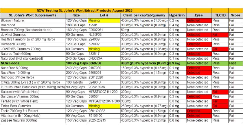 Across 22 brands, only NOW’s products met total label claim for hypericin, and contained no synthetic dyes. Nine brands contained synthetic dyes, five brands had no detectable hypericin, and all gummy products lacked detectable hypericin. St. John’s Wort, as a whole herb, may have hypericin content as low as 0.03%, and of the six products which contained non-standardized material, all had less than this amount.