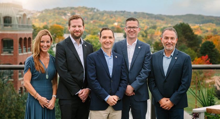 NSF leaders from left to right: Sarah Krol, VP, Food and Nutrition; Alex Adams; Pedro Sancha, President and CEO; George Powell and Scott Morris, SVP, International Markets and Laboratories. Adams and Powell are the former Cambium Analytica Co-founders and CEOs. Photo courtesy of NSF